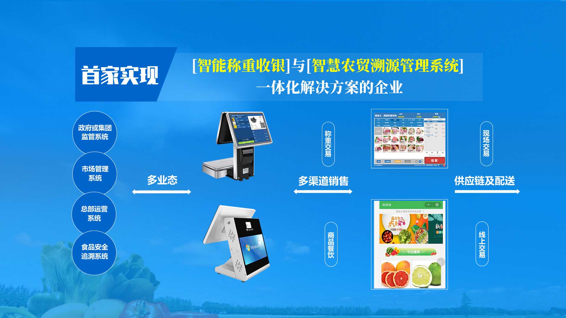 創(chuàng)新實(shí)現(xiàn)了【智慧農(nóng)貿(mào)溯源管理系統(tǒng)】與【智能稱(chēng)重收銀】一體化解決方案,集市場(chǎng)管理、運(yùn)營(yíng)管理、溯源追溯、智能收銀大數(shù)據(jù)運(yùn)用于一體,硬件、軟件與管理系統(tǒng)完美結(jié)合。適用于農(nóng)批、農(nóng)貿(mào)市場(chǎng)蔬菜、生鮮、水果、水產(chǎn)、肉類(lèi)、熟食等稱(chēng)重和非稱(chēng)重銷(xiāo)售;由于采用一體化設(shè)計(jì),解決了傳統(tǒng)農(nóng)貿(mào)市場(chǎng)無(wú)法實(shí)現(xiàn)的信息化、智能化、可追溯的管理問(wèn)題;使稱(chēng)重、收銀、追溯、管理、更透明、公正、安全,讓顧客無(wú)后顧之憂(yōu),給管理工作帶來(lái)極大的便捷與高效,對(duì)國(guó)內(nèi)農(nóng)產(chǎn)品行業(yè)的發(fā)展、農(nóng)產(chǎn)品流通管理起到了典范作用。 【睿途士首創(chuàng)】顛覆傳統(tǒng)的“智慧農(nóng)貿(mào)市場(chǎng)系統(tǒng)”,解決了傳統(tǒng)農(nóng)貿(mào)系統(tǒng)單一安卓掛屏,昂視不方便看、不直觀(guān)、無(wú)互動(dòng)性,傳輸信息不齊全、不穩(wěn)定的問(wèn)題,也解決了按鍵電子秤商品難找、商品代碼難記、按鍵操作不靈活、支付不智能,對(duì)收銀管理、銷(xiāo)售商品、菜名、菜價(jià)、打折、優(yōu)惠、會(huì)員、線(xiàn)上下單、采購(gòu)等無(wú)法實(shí)現(xiàn)實(shí)際菜品交易和追溯等問(wèn)題。 更具顛覆性的是睿途士智慧系統(tǒng)擁有三大管理平臺(tái)(市場(chǎng)管理平臺(tái)、總部運(yùn)營(yíng)管理平臺(tái)、商戶(hù)后臺(tái)管理平臺(tái))、一個(gè)可視操作前臺(tái)和三大追溯功能,讓遠(yuǎn)程管理、數(shù)據(jù)傳輸、人機(jī)互動(dòng)、智能控制、移動(dòng)支付、大數(shù)據(jù)、互聯(lián)通信、云端存儲(chǔ)、人工智能、智能城市、電子定位、智能收銀等功能得以實(shí)現(xiàn)。
