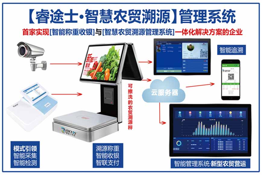 創(chuàng)新實(shí)現(xiàn)了【智慧農(nóng)貿(mào)溯源管理系統(tǒng)】與【智能稱重收銀】一體化解決方案,集市場(chǎng)管理、運(yùn)營(yíng)管理、溯源追溯、智能收銀大數(shù)據(jù)運(yùn)用于一體,硬件、軟件與管理系統(tǒng)完美結(jié)合。適用于農(nóng)批、農(nóng)貿(mào)市場(chǎng)蔬菜、生鮮、水果、水產(chǎn)、肉類、熟食等稱重和非稱重銷售;由于采用一體化設(shè)計(jì),解決了傳統(tǒng)農(nóng)貿(mào)市場(chǎng)無法實(shí)現(xiàn)的信息化、智能化、可追溯的管理問題;使稱重、收銀、追溯、管理、更透明、公正、安全,讓顧客無后顧之憂,給管理工作帶來極大的便捷與高效,對(duì)國(guó)內(nèi)農(nóng)產(chǎn)品行業(yè)的發(fā)展、農(nóng)產(chǎn)品流通管理起到了典范作用。 【睿途士首創(chuàng)】顛覆傳統(tǒng)的“智慧農(nóng)貿(mào)市場(chǎng)系統(tǒng)”,解決了傳統(tǒng)農(nóng)貿(mào)系統(tǒng)單一安卓掛屏,昂視不方便看、不直觀、無互動(dòng)性,傳輸信息不齊全、不穩(wěn)定的問題,也解決了按鍵電子秤商品難找、商品代碼難記、按鍵操作不靈活、支付不智能,對(duì)收銀管理、銷售商品、菜名、菜價(jià)、打折、優(yōu)惠、會(huì)員、線上下單、采購(gòu)等無法實(shí)現(xiàn)實(shí)際菜品交易和追溯等問題。 更具顛覆性的是睿途士智慧系統(tǒng)擁有三大管理平臺(tái)(市場(chǎng)管理平臺(tái)、總部運(yùn)營(yíng)管理平臺(tái)、商戶后臺(tái)管理平臺(tái))、一個(gè)可視操作前臺(tái)和三大追溯功能,讓遠(yuǎn)程管理、數(shù)據(jù)傳輸、人機(jī)互動(dòng)、智能控制、移動(dòng)支付、大數(shù)據(jù)、互聯(lián)通信、云端存儲(chǔ)、人工智能、智能城市、電子定位、智能收銀等功能得以實(shí)現(xiàn)。