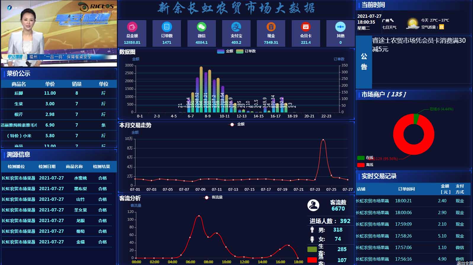 對(duì)價(jià)格、檢測(cè)等信息,進(jìn)行輪播公示,提升市場(chǎng)信息透明度。通過市場(chǎng)內(nèi)的智能設(shè)備鏈接采集數(shù)據(jù),應(yīng)用云計(jì)算、大數(shù)據(jù)、物聯(lián)網(wǎng)技術(shù),提高農(nóng)貿(mào)市場(chǎng)管理水平、增加經(jīng)營(yíng)收入;為消費(fèi)者提供誠(chéng)信消費(fèi)環(huán)境,舒心購(gòu)物場(chǎng)所;為政府部門提高食品安全監(jiān)管,提供食品溯源通道。